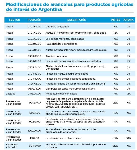 Pesca: se redujo del 10% al 5% el arancel sobre sobre merluza, tanto entera, congelada como filetes; raya y tilapia congeladas; anchoas saladas y cangrejos congelados.
