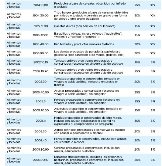 Pre-mezclas y panificados: sobre pre-mezclas para elaboración de panificados, con una importante reducción del 25% al 10%, así como sobre pastas secas, pastas rellenas (por ejemplo, ravioles, excepto con relleno de carne), entre otros, del 15% al 10%.