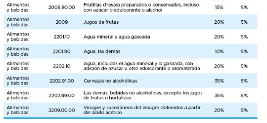 Alimentos y bebidas: una importante rebaja en los aranceles de varios productos alimenticios, muchos de un arancel del 35%-15% al 10%-5%. Tales son los casos de cereales para desayuno, trigo bulgur, galletitas dulces, tomate en conserva, arvejas en conserva, porotos en conserva, aceitunas, maní preparado, frutas en conserva, jugos de frutas, agua embotellada, cerveza y vinagre.