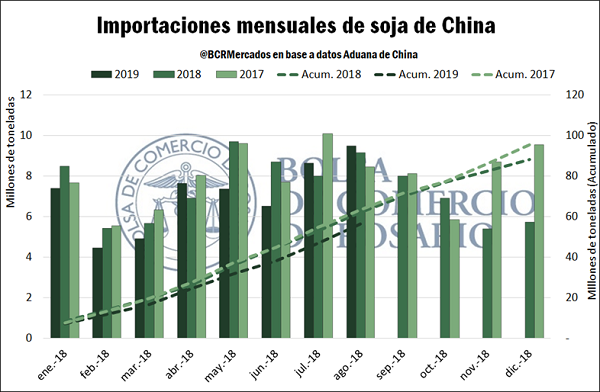 En las últimas tres semanas, Estados Unidos cerró ventas a Chinas por importantes volúmenes de soja, manteniéndose los operadores pendiente de estos anuncios. En este período, China compró 1,3 Mt de soja estadounidense de campaña 2019/20. En el medio de la tensión comercial que se registra entre China y Estados Unidos, esto se puede interpretar como un gesto de buena voluntad para limar asperezas entre ambas potencias, aunque existen participantes del mercado que indican la posibilidad de que esto sea transitorio y se vuelva nuevamente una escala en las medidas proteccionistas de ambos países