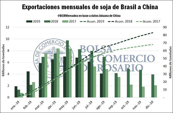 El gigante asiático continuó durante ese mes abasteciendo la mayor parte de su demanda desde Brasil, desde donde importó 6,68 Mt (40,4 Mt desde enero a agosto). En tanto, las importaciones desde EE.UU. totalizaron 1,7 Mt (8,4 Mt el acumulado anual), con las importaciones desde nuestro país siendo de 654.555 t (4,1 Mt acumuladas). Si miramos los datos de exportaciones de Brasil a China, se puede observar que existe una caída en el acumulado anual del año 2019 comparado con el año 2018. Hasta agosto, en el año 2019 se llevan exportados 42.8 millones de toneladas de soja a China, casi un 16 % más bajo respecto al año anterior. Inclusive, el dato de exportaciones de soja de Brasil este año es bajo que el año 2017 donde se alcanzó un total de 44,2 Mt.