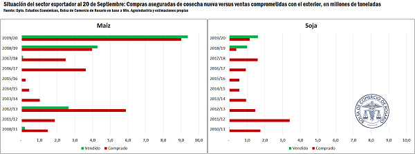 El gráfico que sigue evidencia esta mayor fluidez de los negocios del cereal para la próxima campaña. A la fecha, el sector exportador ha originado localmente y comprometido externamente un volumen récord de cereal para la campaña comercial que va de marzo 2020 a febrero 2021. Con compras por 9 Mt y ventas al exterior por 9,4Mt, ambos valores más que duplican los registros del año pasado.