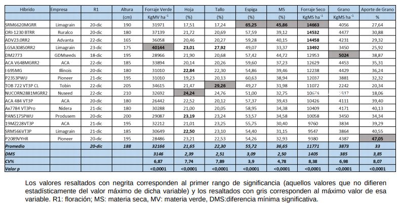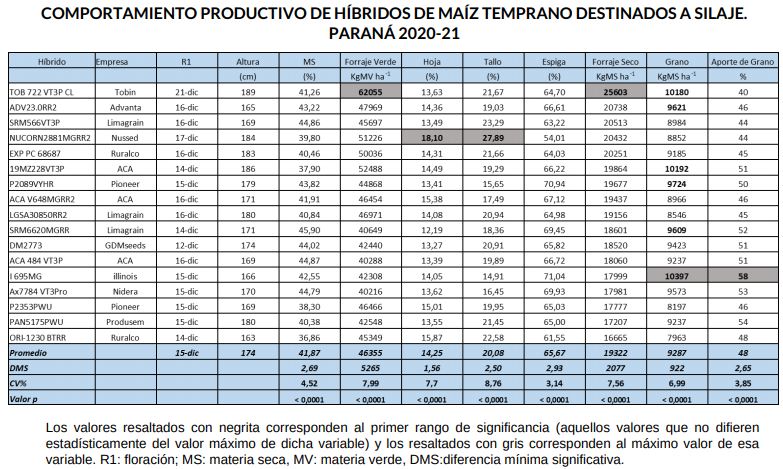 El comportamiento fenológico y productivo (producción de biomasa verde y seca, rendimiento de grano y el aporte del mismo a la biomasa total) de diferentes materiales de maíz para caracterizar su aptitud silera. Se evaluaron 17 híbridos de maíz con destino a silaje de planta entera implantados el 23/09/2020 en el campo experimental de la EEA Paraná del INTA (31° 50’ S, 60°31’ O, 110 msnm). Se utilizó un diseño alfa látice con 3 repeticiones y parcelas de 10,4 m² (4 surcos de 5 m de largo distanciados a 0,52 m). El año 2020 en la EEA Paraná fue extremadamente seco (693 mm), la recarga otoñal del perfil del suelo fue parcial por los bajos valores de las precipitaciones. Algo parecido sucedió durante el barbecho invernal. Luego durante el ciclo del cultivo de maíz las lluvias ocurridas permitieron un crecimiento y desarrollo adecuado. Durante el período reproductivo la disponibilidad hídrica no limitó la fijación de granos. La floración promedio de los híbridos se registró el 15/12. Los cortes se realizaron desde el 4 al 10/2, según los híbridos, con un rango en el contenido de materia seca de la planta de 37 % a 46 % dependiendo del híbrido y en un estado de llenado de grano de R3/R4.
