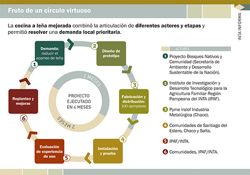 Las 100 cocinas se construyeron y se ensamblaron en la pyme Iralof Industria Metalúrgica durante los dos primeros meses del plazo. En los dos meses posteriores, se llevó a cabo en terreno el plan piloto para iniciar el proceso de entrega, capacitación, ensayos a campo y adaptación de uso en las comunidades de Santiago del Estero, una de las tres provincias donde se implementa el proyecto de Bosques y Comunidad.