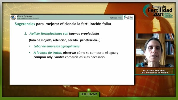 Fernández indicó que la fertilización foliar se recomienda cuando el suelo presenta problemas (como pH alto que limita la capacidad de absorción de la raíz), o también cuando la planta está en activo crecimiento y demandanutrientes (mayormente a principios de la primavera, con la aparición de las hojas y la fructificación).