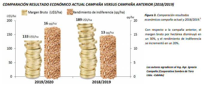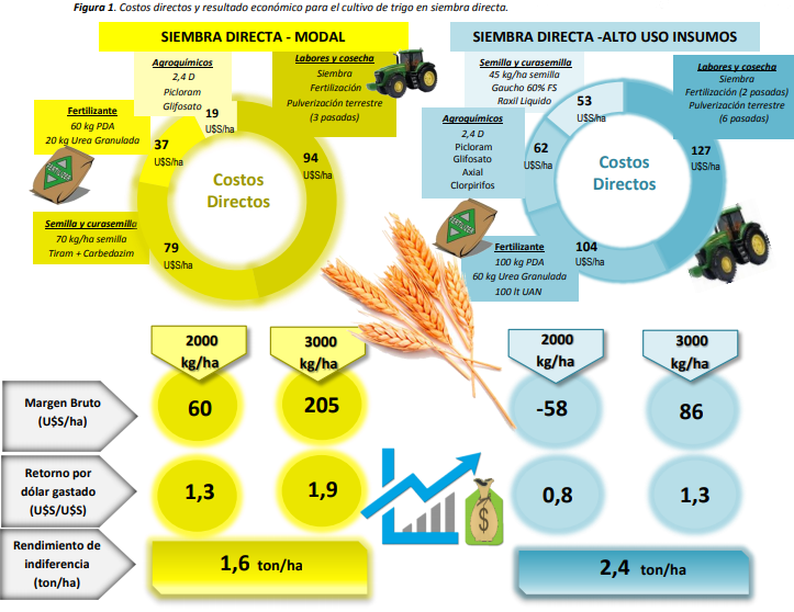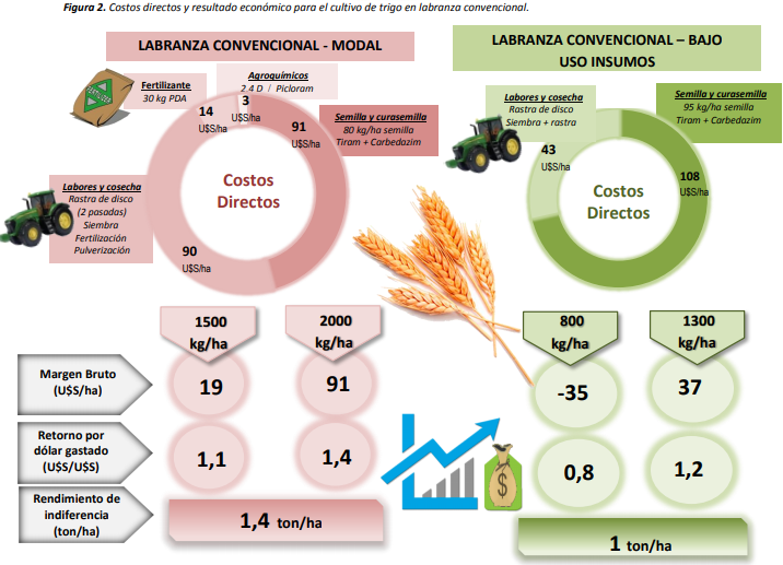 El trigo es uno de los principales cereales de invierno realizados en la zona semiárida. A continuación, se presenta el análisis económico para la campaña de fina 2019/2020 próxima a finalizar, restando una mínima superficie de cosecha. Los rindes utilizados en cada caso se establecieron en base a los valores registrados en el Sudoeste Bonaerense Semiárido (los mismos presentaron valores muy dispares debido a las condiciones climáticas acontecidas durante 2019). Se evaluaron cuatro formas de producción en función al nivel tecnológico adoptado para cada modalidad productiva, estableciendo los costos directos en base a las labores realizadas y los insumos aplicados. En el caso de siembra directa se asumió que las labores fueron contratadas, y para siembra convencional se consideró el uso de maquinaria propia. Para el cálculo de los resultados económicos se consideró el valor a enero 2020 establecido por MATba de 182 U$S/ton, y se utilizaron los precios de labores e insumos relevados a nivel regional (diciembre 2019 sin IVA). Este análisis económico sólo pretende ser una guía respecto de los ingresos en base a la inversión realizada en cada caso. Cabe aclarar que a la hora de evaluar el resultado de la campaña, cada establecimiento deberá tener en consideración: el resultado económico, el aspecto financiero, la disponibilidad de superficie, los objetivos de producción y la mano de obra a disposición.