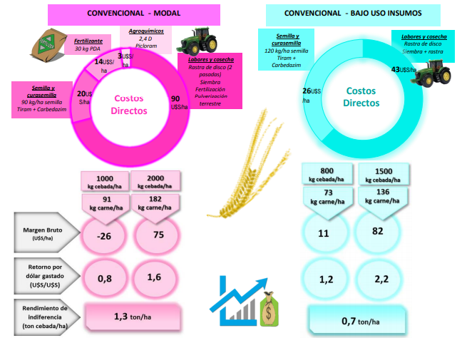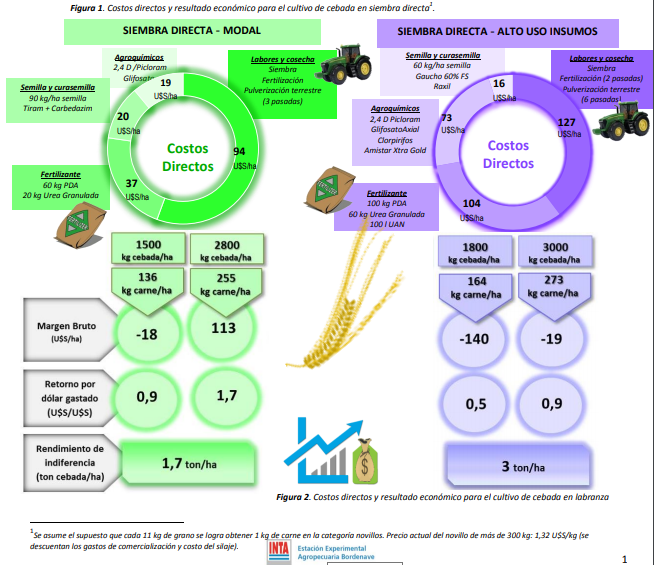 La cebada es uno de los cereales forrajeros de invierno realizados en la zona semiárida con destino a engorde de vacunos. A continuación, se presenta el análisis económico para la campaña de fina 2019/2020 próxima a finalizar, restando una mínima superficie de cosecha. Los rindes utilizados en cada caso se establecieron en base a los valores registrados en el Sudoeste Bonaerense Semiárido (los mismos presentaron valores muy dispares debido a las condiciones climáticas acontecidas durante 2019). Se evaluaron cuatro formas de producción en función al nivel tecnológico adoptado para cada modalidad productiva, estableciendo los costos directos en base a las labores realizadas y los insumos aplicados. En el caso de siembra directa se asumió que las labores fueron contratadas, y para siembra convencional se consideró el uso de maquinaria propia. Para el cálculo de los resultados económicos se utilizaron los precios de labores e insumos relevados a nivel regional (diciembre 2019 sin IVA). Este análisis económico sólo pretende ser una guía respecto de los ingresos en base a la inversión realizada en cada caso. Cabe aclarar que a la hora de evaluar el resultado de la campaña, cada establecimiento deberá tener en consideración: el resultado económico, el aspecto financiero, la disponibilidad de superficie, los objetivos de producción y la mano de obra a disposición.