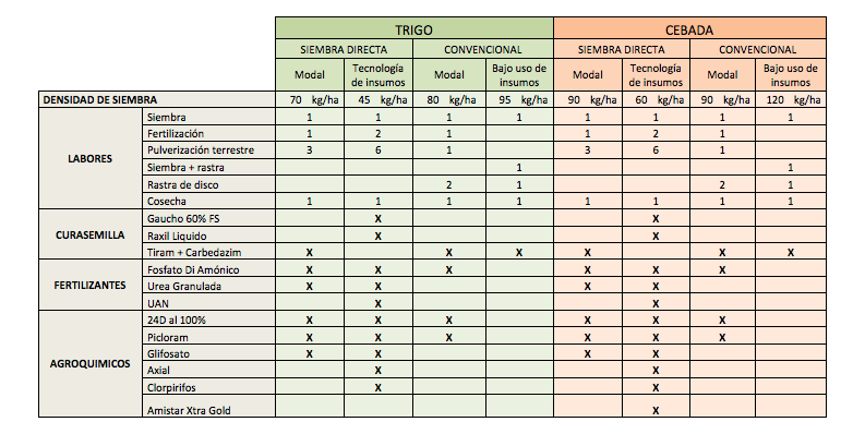 El trigo y la cebada son los principales cereales de invierno realizados en la zona semiárida. A continuación se presenta el análisis económico para el cierre de campaña de fina 2017/2018. Se evaluaron cuatro formas de producción para cada uno de los cultivos: el sistema modal de la zona (tanto en siembra directa como convencional), la siembra directa (SD) con tecnología de insumos y la labranza convencional con bajo uso de insumos.