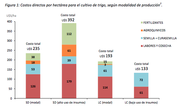 3 En el caso de las labores contratadas, se considera un valor de la UTA contratista de equivalente a 38 litros de gasoil. Cuando se utiliza maquinaria propia, se contempla el costo de mano de obra, gasoil y gastos en repuestos y reparaciones. Para el cálculo del consumo de gasoil se considera un tractor de 120 HP en la siembra convencional modal, y de 100 HP en el caso de bajo uso de insumos. 4 Para el cálculo de los costos de comercialización se considera los costos de: flete largo (100 km), impuesto y sellado, paritaria, secado, comisión del acopio y pesaje en balanza pública