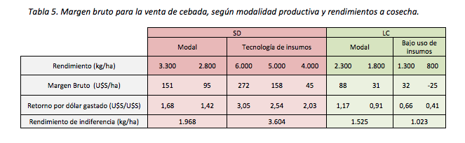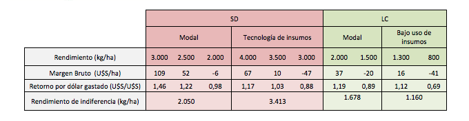 Para cada modalidad de producción se estableció el umbral de rendimiento por hectárea obtenido en la presente campaña. De esta forma se efectuó el cálculo del margen bruto por hectárea para cada rendimiento, a efectos de poder establecer la variación en el resultado económico en cada caso.