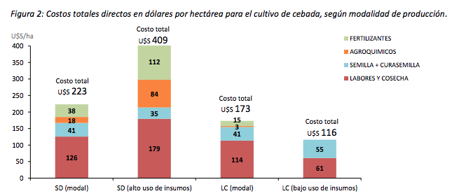 El trigo y la cebada son los principales cereales de invierno realizados en la zona semiárida. A continuación se presenta el análisis económico para el cierre de campaña de fina 2017/2018. Se evaluaron cuatro formas de producción para cada uno de los cultivos: el sistema modal de la zona (tanto en siembra directa como convencional), la siembra directa (SD) con tecnología de insumos y la labranza convencional con bajo uso de insumos.