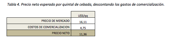 El precio percibido por el productor se estimó en base al valor de la tonelada de cebada informada por la Bolsa de Cereales de Bahía Blanca. Luego se descontaron los gastos de comercialización en base a las tarifas vigentes en nuestra zona al día de la fecha. El valor neto se estableció por quintal.