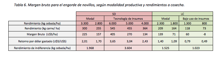 Tabla 3. Margen bruto según modalidad productiva y rendimientos a cosecha