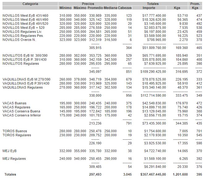 Precios definitivos por categoría para el miércoles 13 de abril