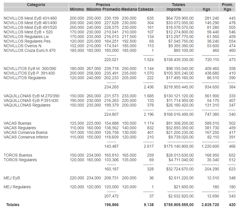 GanaderíaCierre de mercado de hacienda el 19 de noviembre 19 de noviembre de 2021FacebookTwitterWhatsAppTelegramEmailImpresión MERCADO DE LINIERSPRECIOS DEFINITIVOS POR CATEGORIA EL VIERNES 19/11/2021Lee también Pronóstico de lluvias hasta el 27 de noviembreMÁS INFO PARA TU CAMPO ENTRÁ AQUÍ