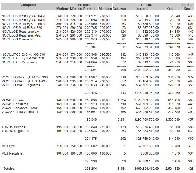 Precios definitivos por categoría para el día 22 de abril de 2022
