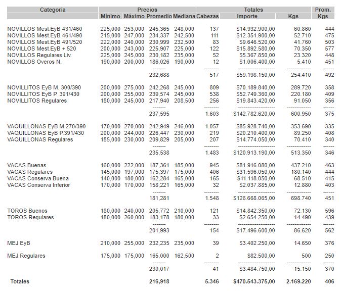 PRECIOS DEFINITIVOS POR CATEGORIA PARA EL MARTES 25 DE ENERO