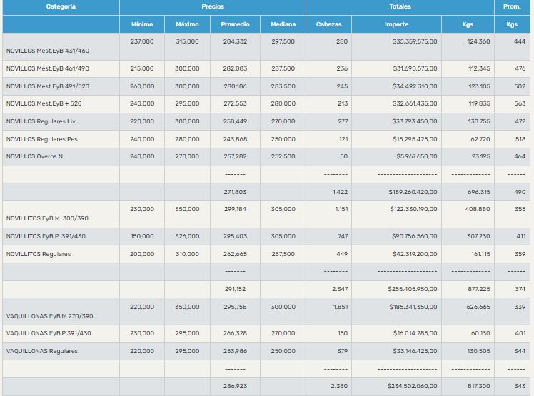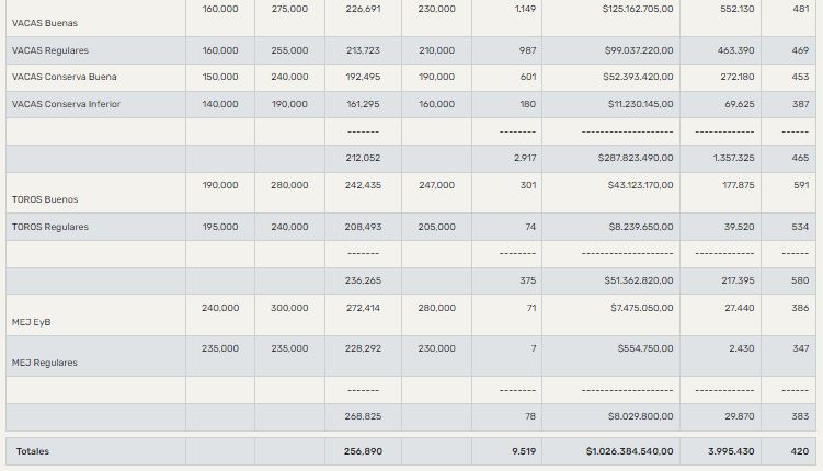 GanaderíaCierre de mercado de hacienda el 25 de noviembre 25 de noviembre de 2022FacebookTwitterWhatsAppTelegramEmailImpresión PRECIOS DEFINITIVOS POR CATEGORIA EL VIERNES 25/11/2022MERCADO GANADEROLee tambiénPronóstico de lluvias hasta el 4 de diciembreSiembra: la de maíz y soja es la más baja en 22 añosTrigo argentino: cae el volumen exportable, el ingreso de camiones y los stocksEs insostenible la situación de inseguridad rural en la Provincia de Santa FeMás incertidumbre que certezas sobre el nuevo “dólar soja”, ante un Gobierno que no se defineFuente: Mercado AgroganaderoMÁS INFO PARA TU CAMPO ENTRÁ AQUÍ