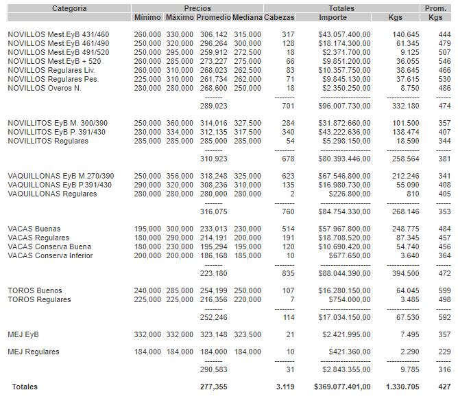 PRECIOS DEFINITIVOS POR CATEGORIA EL VIERNES 29 DE JULIO