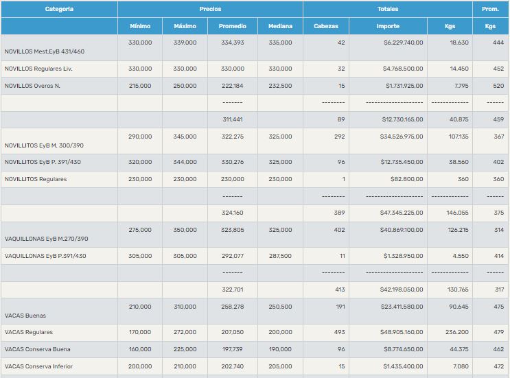 GanaderíaCierre de mercado de hacienda el 30 de diciembre 30 de diciembre de 2022FacebookTwitterWhatsAppTelegramEmailImpresión PRECIOS DEFINITIVOS POR CATEGORÍA EL VIERNES 30/12/2022MERCADO GANADEROLee tambiénPronóstico de lluvias hasta el 7 de eneroTras lluvias muy dispares, los productores apuran y arriesgan las siembras pendientesPor la sequía, las exportaciones de trigo serán las más bajas de los últimos 8 añosFlete camionero para granos en Argentina y su comparación con Estados Unidos y BrasilNutrir la gruesa tras perder la fina Fuente: Mercado AgroganaderoMÁS INFO PARA TU CAMPO ENTRÁ AQUÍ