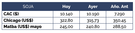 En la tarde de hoy, el valor ofrecido abiertamente por la oleaginosa con entrega contractual se ubicó en $ 10.000/t, pero se registraron operaciones por encima de este valor. Por soja condición cámara con entrega en agosto de este año, el precio ofrecido fue de $ 10.300/t. La novedad con respecto a la jornada de ayer fue la presencia de un comprador en el segmento mayo 2020, ofreciendo abiertamente US$ 245/t.