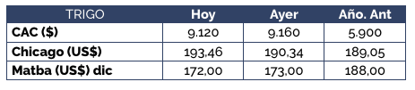 El valor ofrecido por la exportación para el trigo contractual alcanzó los US$ 200/t, mismo valor ofrecido el día de ayer, aunque no se descartan mejoras en dicho valor. Es de destacar la menor cantidad de compradores activos entre ayer y hoy, ya que el día de hoy solo hubo dos compradores en el segmento disponible. En cuanto a la posición de julio de este año, el valor abierto se mantuvo en US$ 185/t. Con respecto a la posición de Nov/Dic/Ene de este año el precio ofrecido fue de US$ 165/t, sin cambios con respecto a la rueda anterior. Por su parte, por el cereal con entrega en febrero la propuesta de compra se ubicó en U$S 168/t y US$ 170/t la posición marzo.