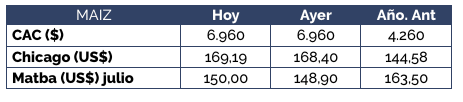 En el día de hoy el precio del maíz con entrega hasta el 15/6 se ubicó en el valor de $ 6600 /t, $ 400/t menor al precio ofrecido en el día de ayer; aun así, no se descartan mejoras en el precio. Para los negocios con entrega en julio, el precio abierto fue de US$ 150/t, mejorando US$ 2/t con respecto al precio de ayer. Para los negocios con descarga en agosto el valor fue también de US$ 150/t, con la posición septiembre en US$ 151/t y octubre en US$ 153/t, todos con ligeras mejoras con respecto a la jornada de ayer. Mientras tanto, el precio para la posición de noviembre fue de US$ 154/t, dos dólares por encima de ayer. Para maíz nuevo, el valor abierto para los meses de febrero, marzo y abril fue de US$ 155/t, manteniéndose con respecto a la jornada de ayer.
