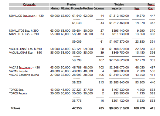 MercadosCierre mercado de hacienda 6 de junio de 2019FacebookTwitterWhatsAppTelegramEmailImpresión PRECIOS POR CATEGORIA RESOL-2018-32-APN-SGA#MPYT DESDE EL JUEVES 06/06/2019 AL JUEVES 06/06/2019PRECIOS DEFINITIVOSFuente: Mercado de LiniersMás información agropecuaria cliqueá aquí