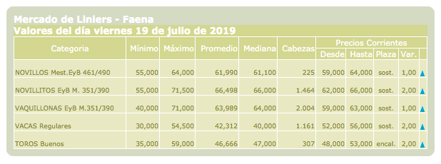 MercadosCierre mercado de hacienda 19 de julio de 2019FacebookTwitterWhatsAppTelegramEmailImpresión Fuente: Mercado de LiniersMás información agropecuaria cliqueá aquí
