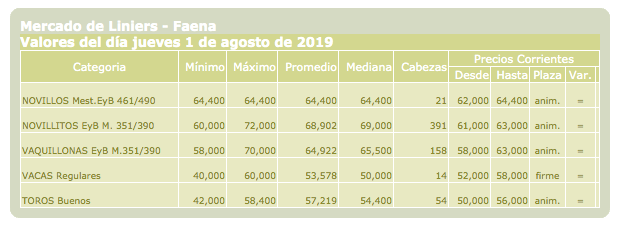 MercadosCierre mercado de hacienda 1 de agosto de 2019FacebookTwitterWhatsAppTelegramEmailImpresión Cierre mercado de hacienda de Liniers Fuente: mercado de LiniersMás información agropecuaria cliqueá aquí
