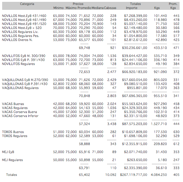 MercadosCierre mercado de hacienda 21 de agosto de 2019FacebookTwitterWhatsAppTelegramEmailImpresión PRECIOS DEFINITIVOS POR CATEGORIA DESDE EL MIÉRCOLES 21/08/2019 AL MIÉRCOLES 21/08/2019MERCADO DE LINIERSMás información agropecuaria cliqueá aquí