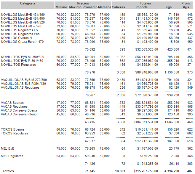 MercadosCierre mercado de hacienda 3 de diciembre de 2019FacebookTwitterWhatsAppTelegramEmailImpresión PRECIOS POR CATEGORIA DESDE EL MARTES 03/12/2019 AL MARTES 03/12/2019 Fuente: Mercado de LiniersMás información agropecuaria cliqueá aquí