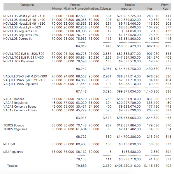 MercadosCierre mercado de hacienda 17 de diciembre de 2019FacebookTwitterWhatsAppTelegramEmailImpresión PRECIOS DEFINITIVOS POR CATEGORIA PARA EL MARTES 17/12/2019MERCADO DE LINIERSMás información agropecuaria cliqueá aquí