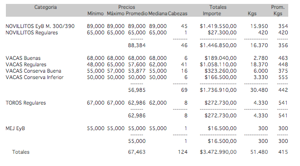 MercadosCierre mercado de hacienda 21 de enero de 2020FacebookTwitterWhatsAppTelegramEmailImpresión PRECIOS DEFINITIVOS POR CATEGORIA PARA EL LUNES 20/01/2020Más información agropecuaria cliqueá aquí