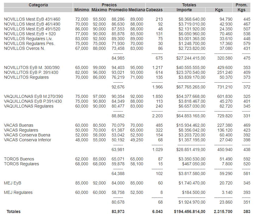 PRECIOS POR CATEGORIA PARA EL VIERNES 07/02/2020