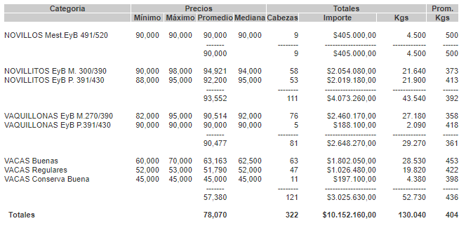 MercadosCierre Mercado de Hacienda 6 de marzo de 2020FacebookTwitterWhatsAppTelegramEmailImpresión PRECIOS DEFINITIVOS POR CATEGORÍA DESDE EL JUEVES 05/03/2020 Fuente: Mercado de Liniers Más información agropecuaria cliqueá aquí