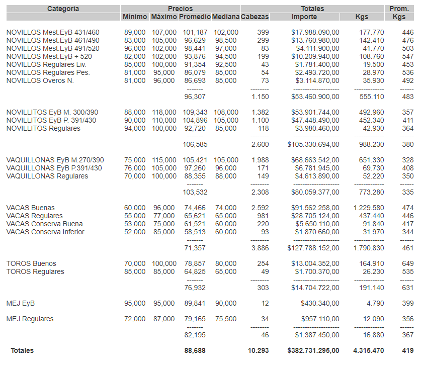 MercadosCierre mercado de hacienda 4 de agosto de 2020FacebookTwitterWhatsAppTelegramEmailImpresión PRECIOS DEFINITIVOS POR CATEGORÍA PARA EL MARTES 04/08/2020MERCADO DE LINIERSMás información agropecuaria cliqueá aquí