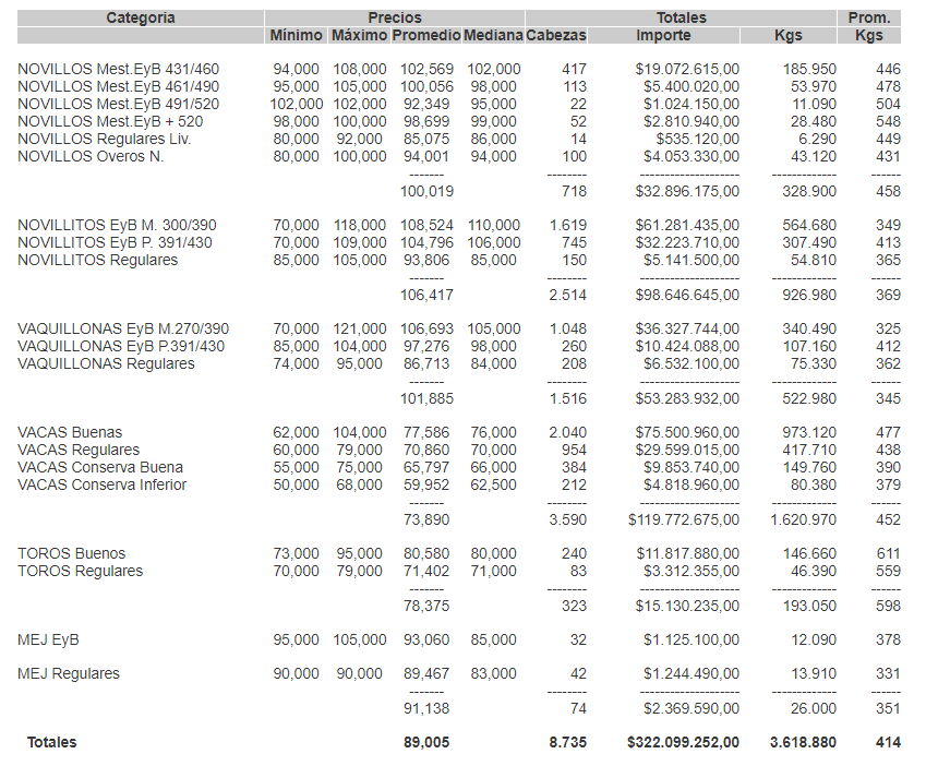 PRECIOS DEFINITIVOS POR CATEGORIA PARA EL MARTES 11/08/2020