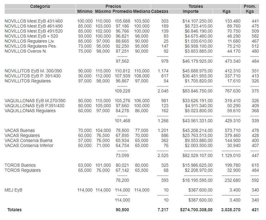 MercadosCierre mercado de hacienda 15 de agosto de 2020FacebookTwitterWhatsAppTelegramEmailImpresión PRECIOS DEFINITIVOS POR CATEGORÍA PARA EL VIERNES 14/08/2020MERCADO DE LINIERS Más información agropecuaria cliqueá aquí