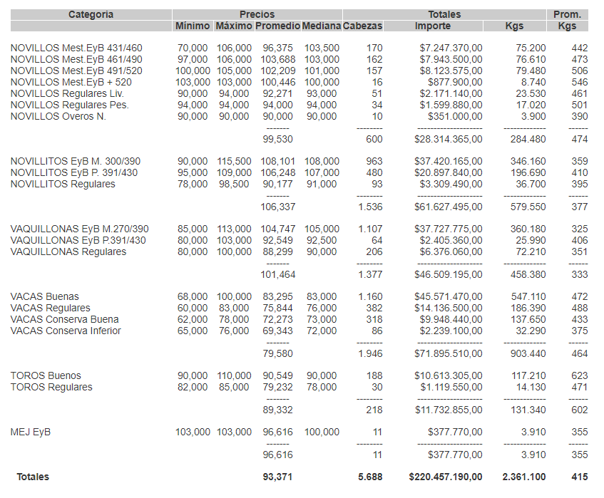 MercadosCierre mercado de hacienda 4 de septiembre de 2020FacebookTwitterWhatsAppTelegramEmailImpresión PRECIOS POR CATEGORÍA DESDE EL VIERNES 04/09/2020MERCADO DE LINIERSMás información agropecuaria cliqueá aquí