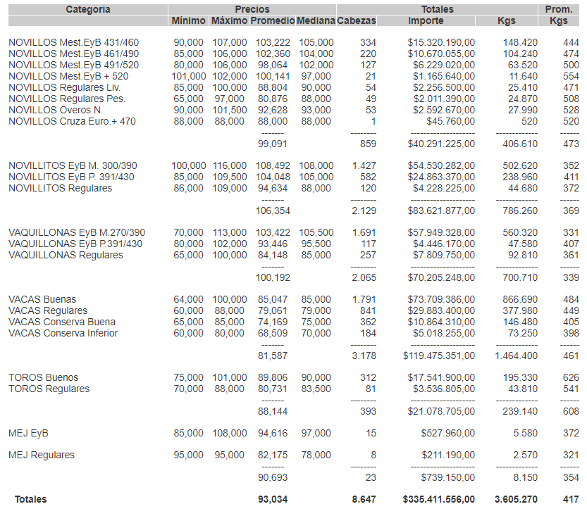 MercadosCierre mercado de hacienda 16 de septiembre de 2020FacebookTwitterWhatsAppTelegramEmailImpresión PRECIOS DEFINITIVOS POR CATEGORÍA PARA EL MARTES 15/09/2020MERCADO DE LINIERSMás información agropecuaria cliqueá aquí