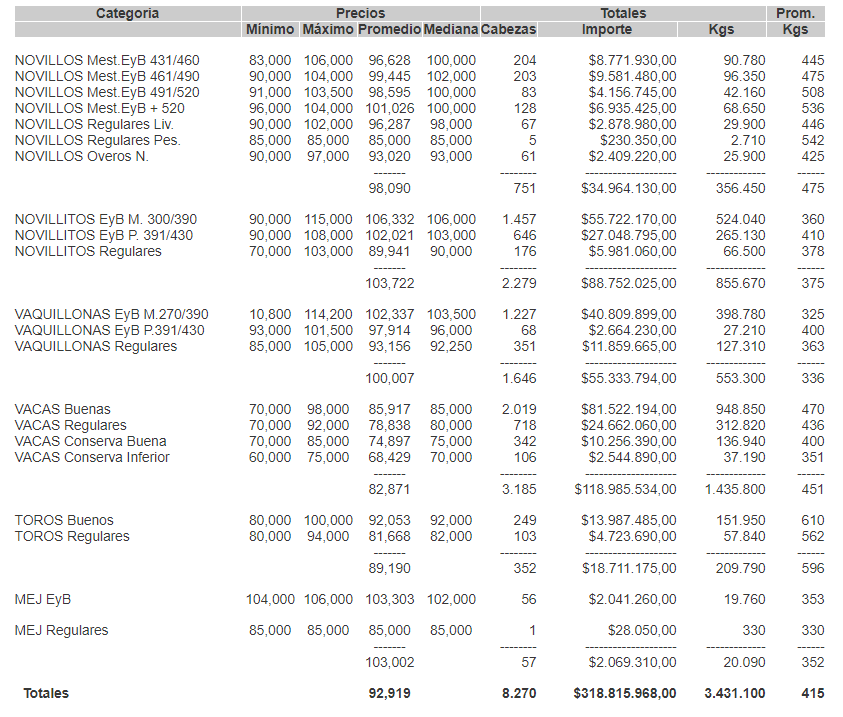 MercadosCierre Mercado de Hacienda 22 de septiembre de 2020FacebookTwitterWhatsAppTelegramEmailImpresión PRECIOS POR CATEGORIA PARA EL MARTES 22/09/2020MERCADO DE LINIERS Más información agropecuaria cliqueá aquí