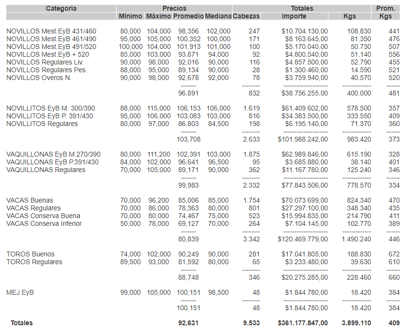 MercadosCierre Mercado de Hacienda 24 de septiembre de 2020FacebookTwitterWhatsAppTelegramEmailImpresión PRECIOS DEFINITIVOS POR CATEGORIA PARA EL MIÉRCOLES 23/09/2020MERCADO DE LINIERSMás información agropecuaria cliqueá aquí