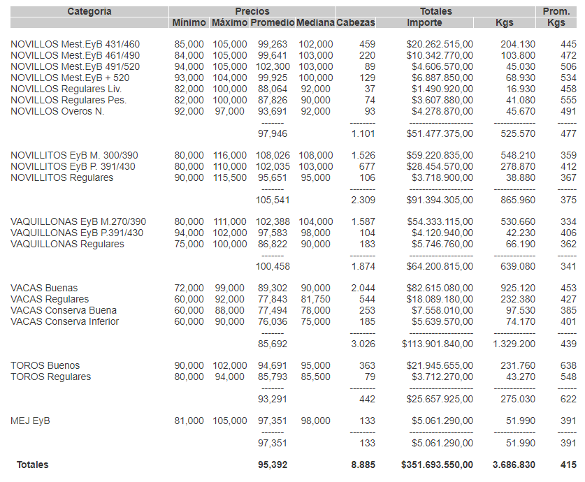 PRECIOS POR CATEGORIA PARA EL VIERNES 02/10/2020