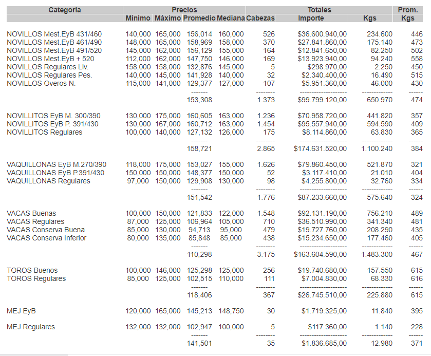 MercadosCierre Mercado de Hacienda 19 de diciembre de 2020FacebookTwitterWhatsAppTelegramEmailImpresión PRECIOS POR CATEGORIA DESDE EL VIERNES 18/12/2020MERCADO DE LINIERSMás información agropecuaria cliqueá aquí