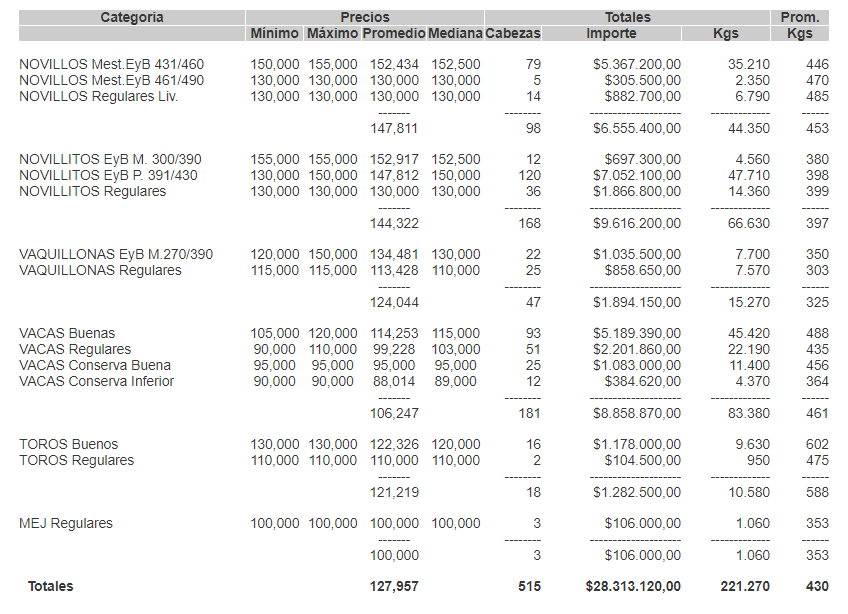 MercadosCierre Mercado de Hacienda 31 de diciembre de 2020FacebookTwitterWhatsAppTelegramEmailImpresión PRECIOS DEFINITIVOS POR CATEGORIA PARA EL MIÉRCOLES 30/12/2020MERCADO DE LINIERSMás información agropecuaria cliqueá aquí