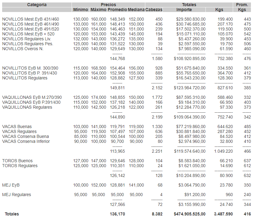 PRECIOS POR CATEGORIA PARA EL MARTES 05/01/2021