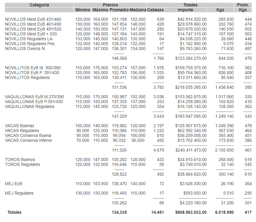 MercadosCierre Mercado de Hacienda 16 de enero de 2021FacebookTwitterWhatsAppTelegramEmailImpresión PRECIOS DEFINITIVOS POR CATEGORIA PARA EL VIERNES 15/01/2021MERCADO DE LINIERSFuente: SMNMás información agropecuaria cliqueá aquí