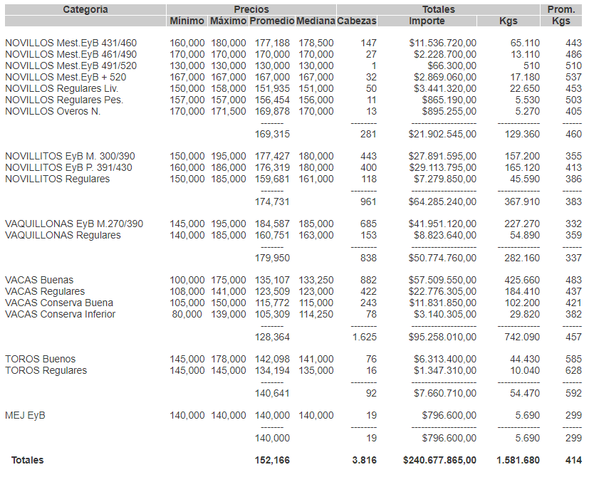 MercadosCierre Mercado de Hacienda 31 de marzo de 2021FacebookTwitterWhatsAppTelegramEmailImpresión PRECIOS DEFINITIVOS POR CATEGORIA PARA EL MIÉRCOLES 31/03/2021MERCADO DE LINIERSMÁS INFORMACIÓN AGROPECUARIA CLIQUEÁ AQUí