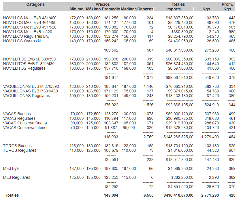 GanaderíaCierre mercado de hacienda el 11 de agosto de 2021 11 de agosto de 2021FacebookTwitterWhatsAppTelegramEmailImpresión PRECIOS DEFINITIVOS POR CATEGORIA EN EL MERCADO DE LINIERS PARA EL MIÉRCOLES 11/08/2021MÁS INFO PARA TU CAMPO ENTRÁ AQUí